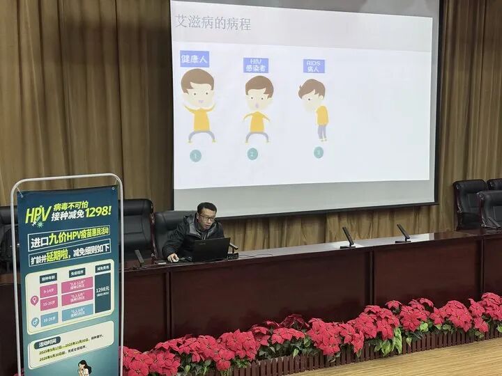 在讲座中,徐鹏从艾滋病的基础知识入手,逐步深入到防控重点。他通过“健康人→HIV感染者→AIDS病人”的病程发展示意图,直观展示艾滋病的发展过程。