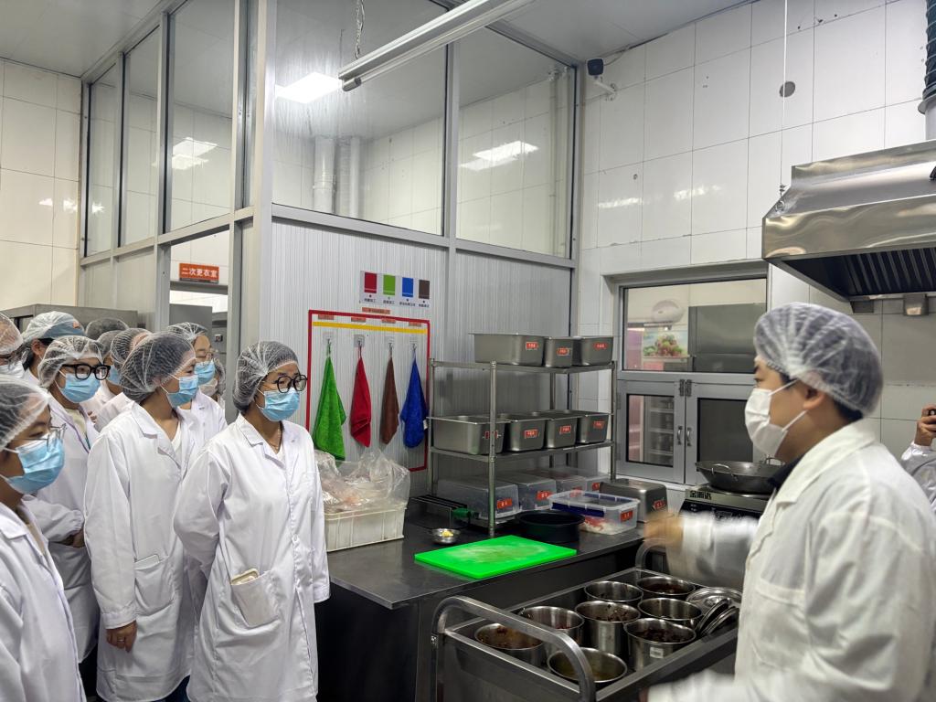 实践环节后,学生们在后勤老师的带领下,依次参观了学校食堂的后厨、食品快速检测室以及大宗物资采购库房。在“二次更衣室”“粗加工间”等区域,学生们直观了解了餐饮服务链中严格的卫生分区与管理制度;在快检室,专业人员演示了日常食材的快速筛查流程;在库房,同学们学习了大宗物资的仓储、溯源与品控管理要点。这一系列的参观,使学生们对“从采购到餐桌”的完整食品安全管控体系有了系统而清晰地认识。